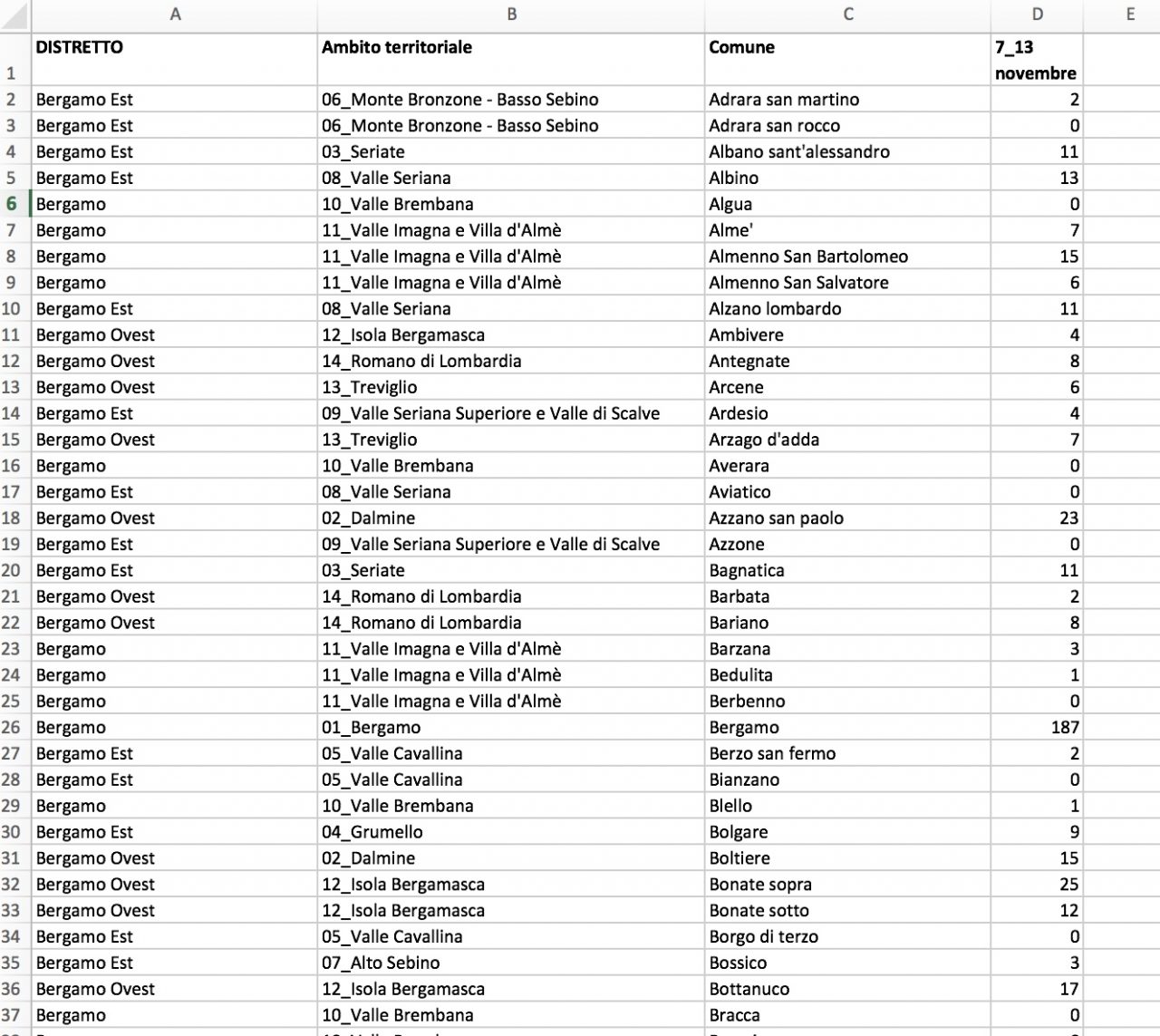 Da sabato 7 a venerdì 13 novembre sono stati 1.862 i casi di Covid accertati in Bergamasca. Il dato è stato reso noto questa mattina (14 novembre) dall’Ats di Bergamo, che ha diffuso una tabella contenente i dati per ognuno dei 243 Comuni della provincia.