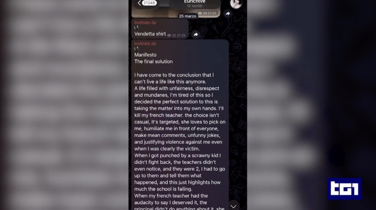 Il giovane utilizzava principalmente Telegram, piattaforma sulla quale non solo ha trasmesso l’aggressione, ma aveva anche preannunciato le sue intenzioni con un lungo testo in inglese. Gli investigatori ritengono che il contenuto sia riconducibile interamente al ragazzo, pur ipotizzando un possibile utilizzo di strumenti di intelligenza artificiale per la sua rielaborazione. vPrima di recarsi a scuola, il tredicenne aveva pubblicato anche uno “stato” in inglese: «Today is the day where I’ll get my sweet revenge» (tradotto “Oggi è il giorno in cui mi prenderò la mia dolce vendetta”).