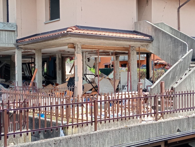 Più ci si avvicina, più si notano particolari fuori posto fino ad arrivare al giardino costellato di macerie e l’interno del primo piano sventrato. Restano solo i piloni.