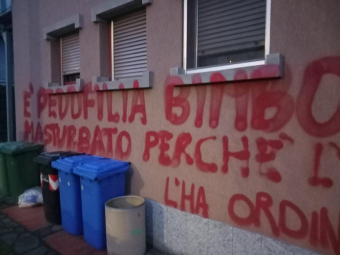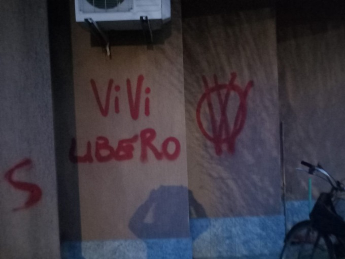A firmarsi con lo spray rosso sono stati i “ViVi”, con la loro doppia “V” inscritta in un cerchio. Si tratta dello lo stesso gruppo negazionista che, sempre lunedì 8 gennaio, ha rovinato i muri della scuola materna del Centro per la Famiglia don Giovanni Ubiali di Cassinone, a Seriate, e l’attiguo centro diurno disabili.