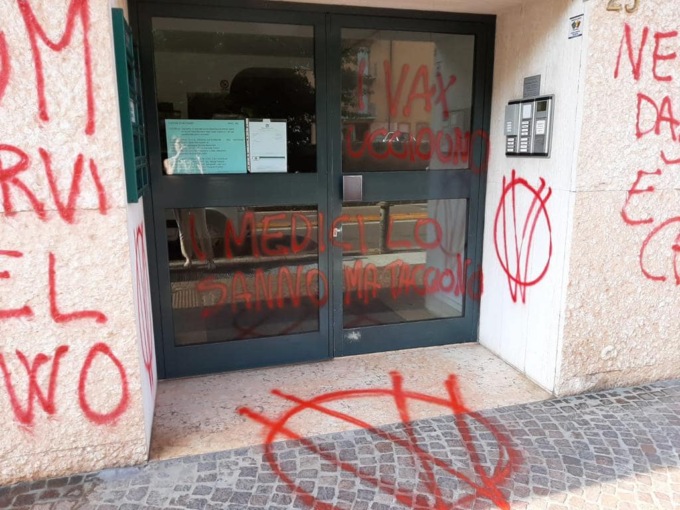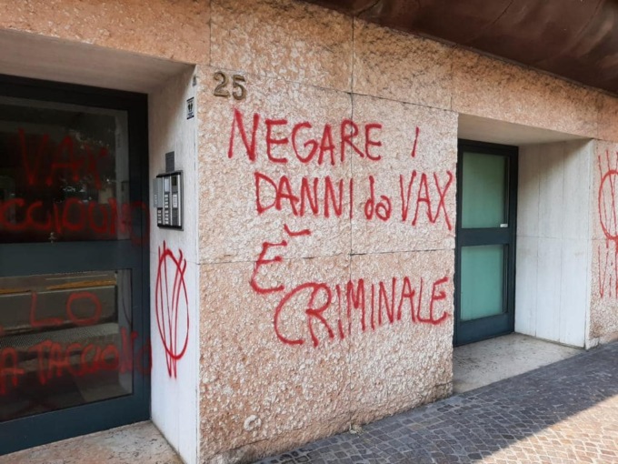 “Negare i danni da vax è criminale”. “Salvate i bambini”. “I medici lo sanno ma tacciono”. E poi, la ormai nota doppia “V” cerchiata, in rosso, e altri deliranti slogan dello stesso genere. Ancora vandali no-vax in azione a Bergamo, questa notte.