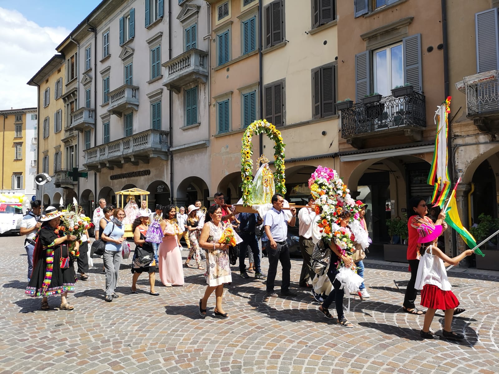 La città di Ferragosto si è fermata ad ammirarli con le loro giacche verde smeraldo, arancione abbagliante, con i cappelli neri e dorati, gli stivaletti, i passi di danza… i boliviani di Bergamo (diverse migliaia) anche giovedì, come ormai da alcuni anni, con una processione del tutto particolare hanno festeggiato la Virgen de Urkupina, la Vergine dell’integrazione, una delle ricorrenze religiose più importanti della Bolivia. La “processione” si è distinta in due parti, la prima la sera del 14, dalla chiesa di San Lazzaro fino al Duomo. Poi giovedì messa solenne in Duomo alle 12.30 e quindi processione a scendere fino alla Fara, a Sant’Agostino per finire in città bassa, attorno a Piazza Pontida, fino di nuovo alla chiesa di San Lazzaro.