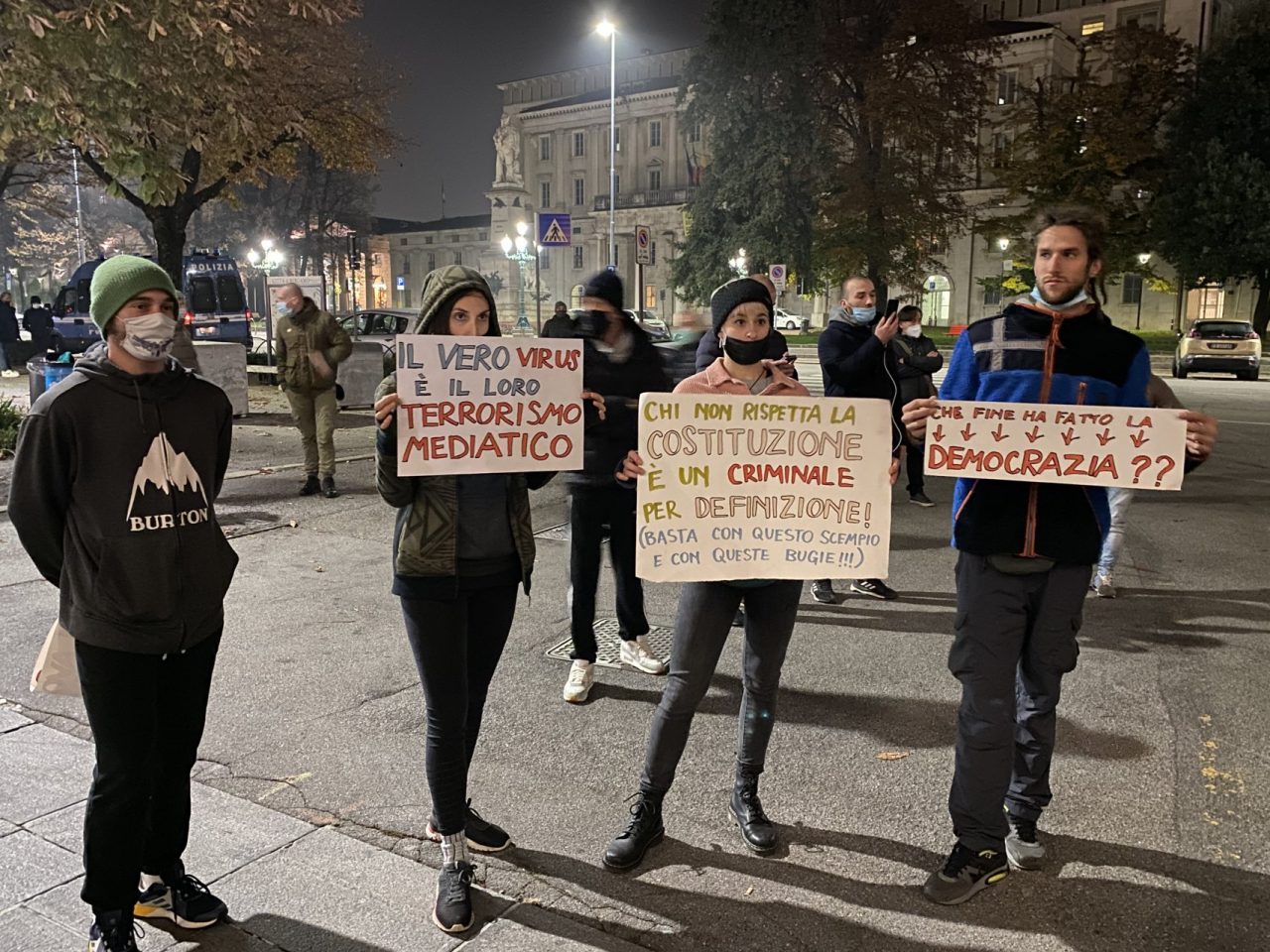 In ogni caso, ieri sera (6 novembre) davanti a Palazzo Frizzoni, a parte un gruppetto di quattro ragazzi con cartelli inneggianti alla democrazia e alla privazione delle libertà individuali («Il vero virus è il loro terrorismo mediatico!»), si è radunato qualche negazionista e un drappello organizzato di giovani armati di tricolori, mascherine e cappucci in testa. A prendere la parola per primo è un uomo che, nel corso di una diretta su Facebook, ha attaccato il presidente del consiglio Giuseppe Conte garantendo che il premier ha già ricevuto «tremila denunce» e che «sarà indagato dalla Corte dei diritti dell’uomo». Poi spiega che il Dpcm non esiste, è un’invenzione di Conte e che comunque la sua “validità” è sostituita dalla Costituzione.