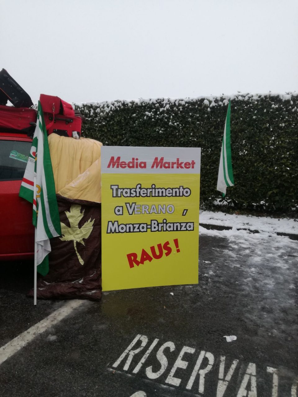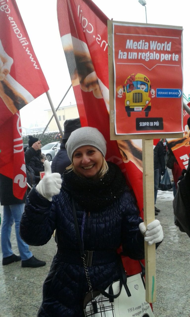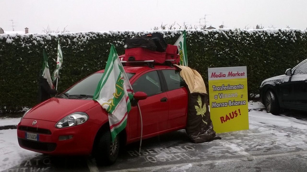 Quella frase che la dirigenza utilizzò per motivare i dipendenti a dare il meglio di sé per fronteggiare la crisi, quel «tirar fuori l’occhio della tigre», proprio non gli è andato giù. E allora, nel presidio di stamattina, venerdì 2 marzo, sotto un’eccezionale nevicata d’inizio marzo (con thermos di tè caldo presi in prestito dai figli che giocano a calcio), i dipendenti della sede centrale di Mediamarket a Curno, ovvero il cuore della catena MediaWorld in Italia, hanno ballato al ritmo della sigla di Tigerman, cartone animato dei primi anni ’80. Girava anche la colonna sonora di Rocky. Mai avrebbero pensato di scendere in strada per protestare, solo qualche anno fa, quando l’azienda elargiva premi e regali e gli affari andavano a gonfie vele. Ora i tempi son cambiati, e l’annuncio repentino dello spostamento di sede a Verano Brianza – per molti dipendenti una scusa per fare tagli al personale a costo zero – è arrivato come una scure su una storia quasi trentennale (la società e nata a Curno nel 1991).