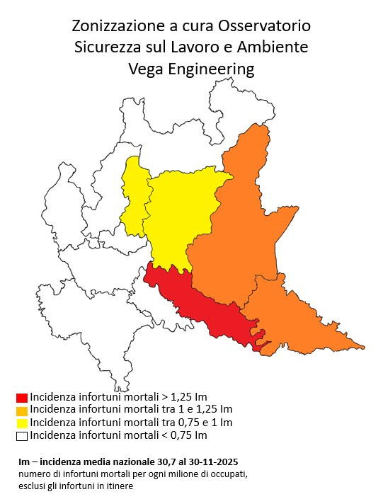 Come spiega l’Osservatorio Sicurezza sul lavoro e ambiente Vega, la zona bianca è quella che raggruppa le regioni con l’incidenza di mortalità sul lavoro più bassa a livello nazionale. A fine novembre 2025, dunque, il rischio di infortunio mortale in Lombardia (21,8 morti per milione di occupati) risulta essere molto al di sotto della media nazionale pari a 30,7. Ovviamente, però, ogni provincia registra una situazione diversa.