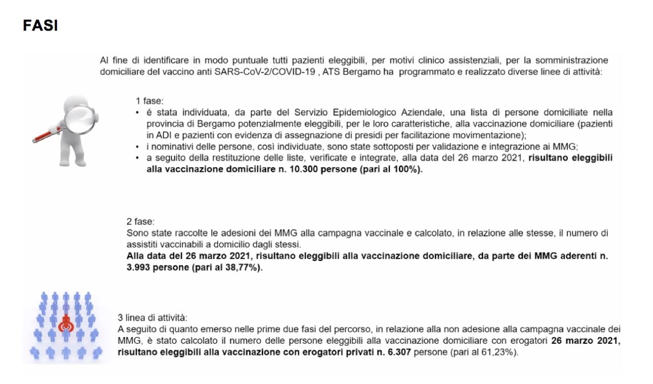 Nel complesso saranno 10.300 i bergamaschi che saranno vaccinati a casa: 3.993 persone (38,77%) verranno vaccinate dai medici di medicina generale; 6.307 (61,23%) con erogatori privati dell’Adi. Queste cifre potrebbero però essere ulteriormente aggiornate perché ci sono alcuni medici di medicina generale che stanno ancora aderendo alla campagna vaccinale.