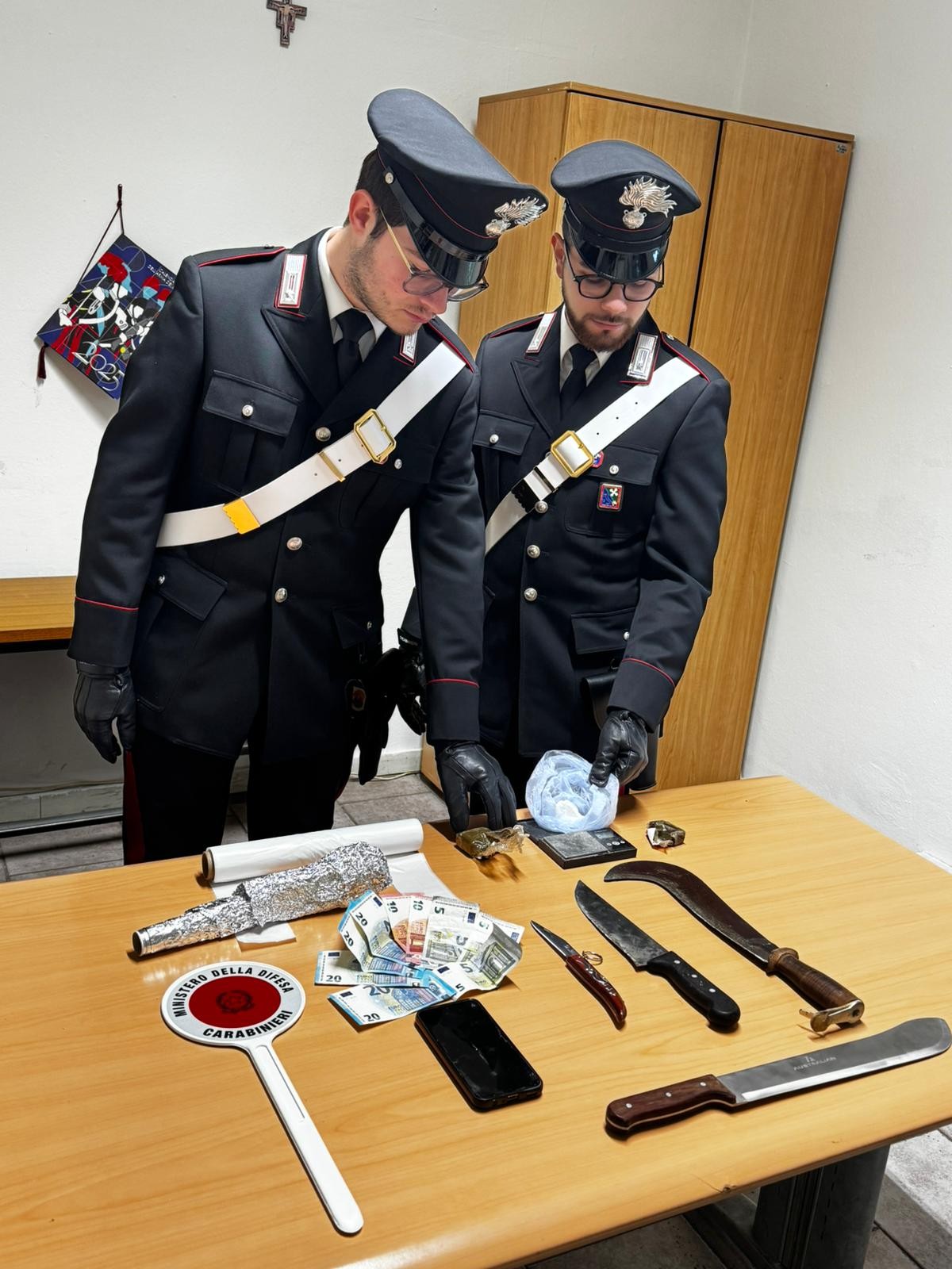 L’ispezione del locale, caratterizzato da un forte odore di hashish, ha consentito di rinvenire e sequestrare circa settanta grammi di questa sostanza e 31 grammi di cocaina. Sotto il materasso e tra i mobili sono stati rinvenuti inoltre un machete, una roncola, un coltello a serramanico e un coltello da cucina con lama di ventuno centimetri, quest’ultimo ancora sporco di sostanza stupefacente.