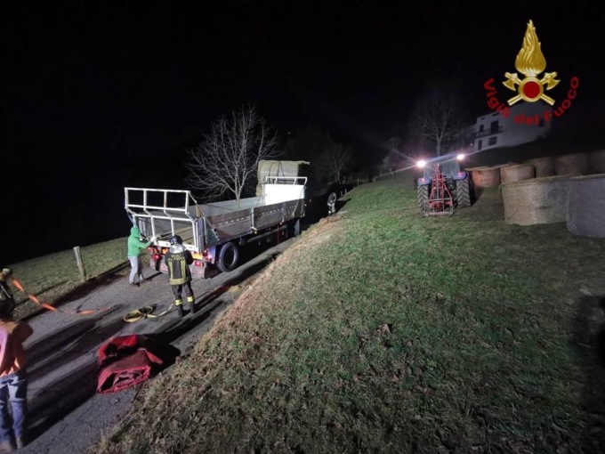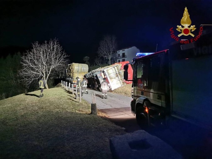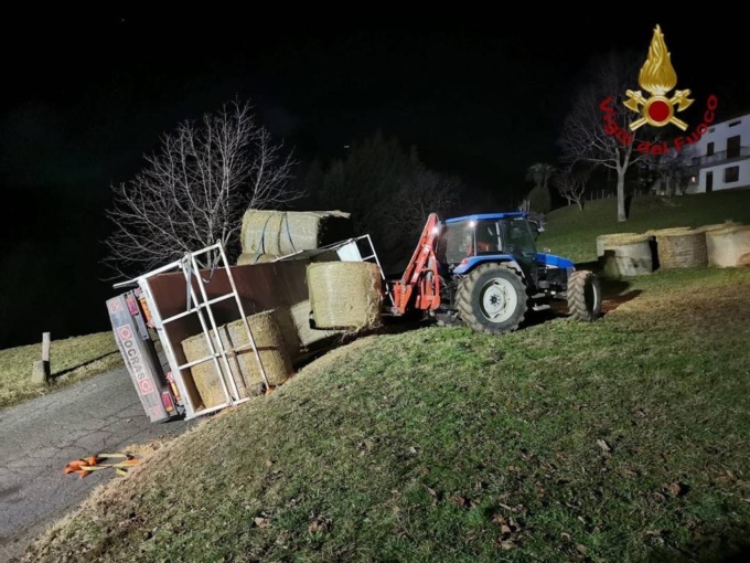 Si è ribaltato e con sé ha fatto cadere anche diversi balloni di fieno. È successo ieri sera, giovedì due febbraio, a Parzanica, quando, a pochi minuti dalle undici, un rimorchio è finito a bordo strada.