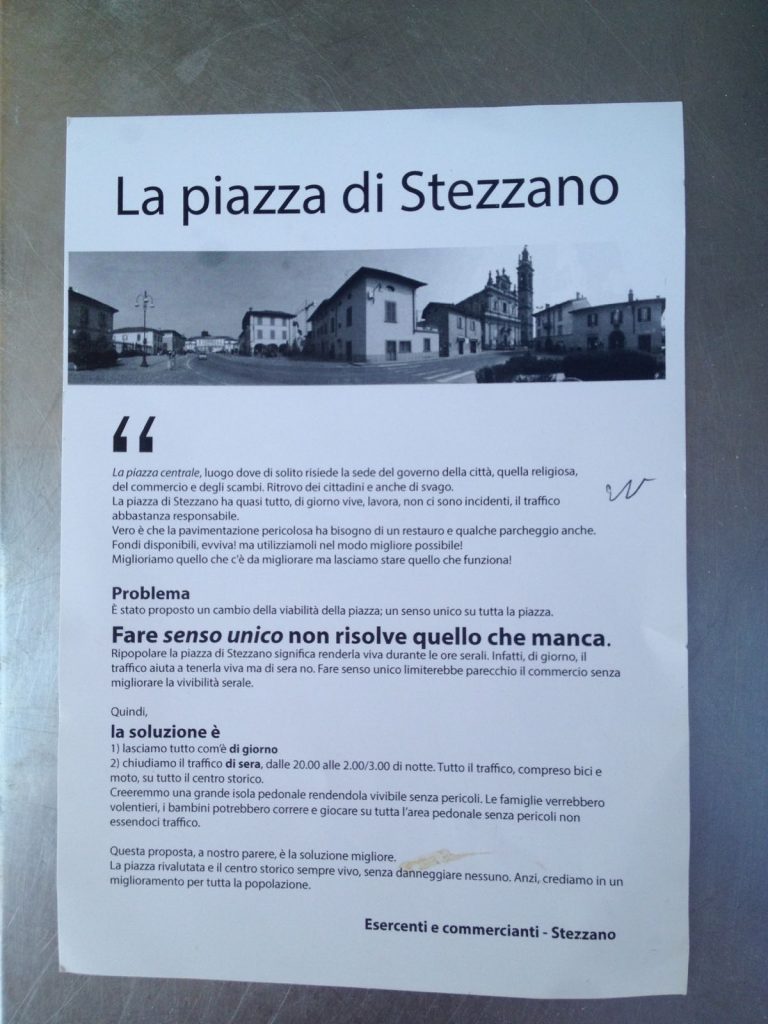 Secondo l’Amministrazione il senso unico è necessario per tutelare la sicurezza dei pedoni e di coloro che si spostano in bicicletta. La strettoia davanti alla chiesa, che dalla piazza porta in via Dante, è effettivamente pericolosa per la mancanza di marciapiedi, sui muri degli edifici che si trovano ai lati sono ben visibili i segni lasciati dagli specchietti delle auto che, per poter passare in due, devono necessariamente rallentare e capita che i veicoli striscino contro le pareti. Una persona disabile non potrebbe transitare in sicurezza con la sedia a rotelle, idem una madre con una carrozzina o un passeggino (sulla strettoia tra l’altro si trovano una farmacia e un asilo nido, ndr). L’intento del Comune è anche quello di restituire la piazza ai cittadini, di farne un luogo di ritrovo, di socializzazione, un punto importante di incontro e di scambio.