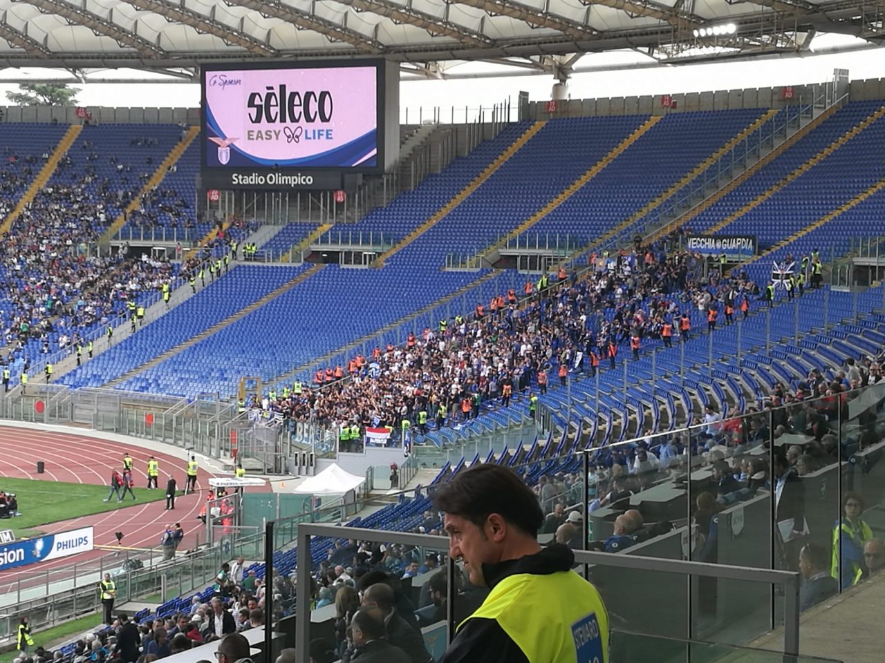 La coda ai tornelli, un’altra doppia perquisizione e il gol di Barrow seguito solo grazie agli smartphone nell’area di filtraggio sono state l’ultima “cartolina” romana prima dell’ingresso nel settore che è avvenuto al 12’ con una rincorsa di gruppo e l’esposizione immediata dello striscione “Bergamo”. Pareggio di Caicedo a parte, i sostenitori orobici hanno dato spettacolo sostenendo la squadra compatti e con grande trasporto: nonostante uno stadio molto carico di tifosi biancocelesti, la squadra di Gasperini ha sentito costantemente il sostegno e i risultati in campo si sono visti.