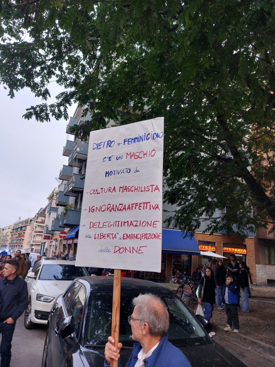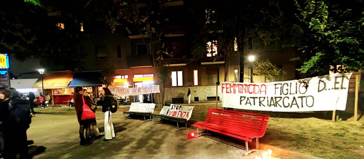 Uno striscione con la scritta «Per Pamela e per tutte» ha aperto il corteo, mentre da un palazzo è comparso un grande drappo con le parole «Il possesso uccide». Sulla panchina, fiori e biglietti lasciati in questi giorni, semplici messaggi come «Ciao Pamela».