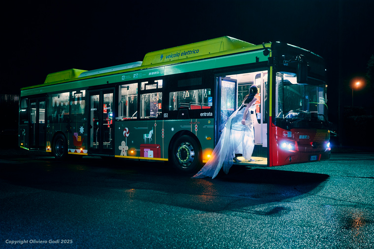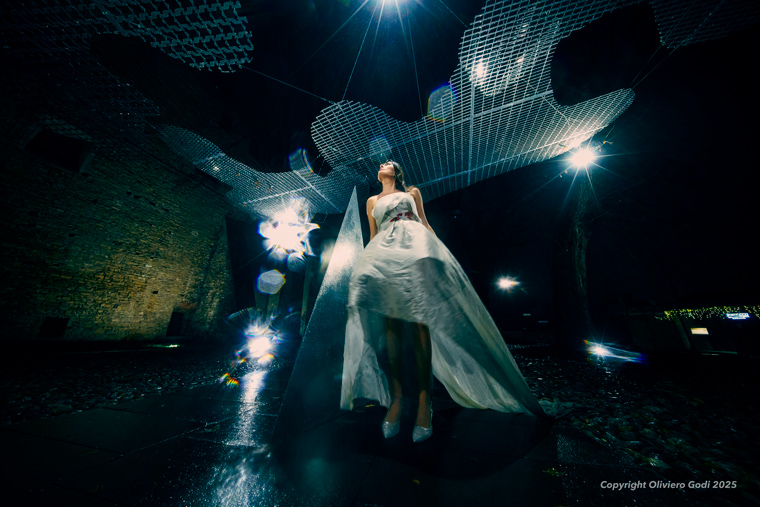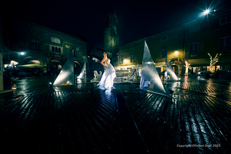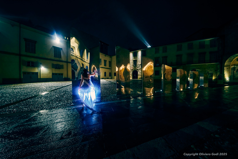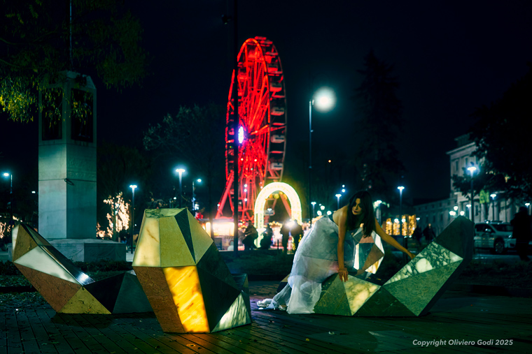 La sua presenza introduce una dimensione concreta e umana nel racconto fotografico: il corpo restituisce movimento, scala e proporzione alle installazioni, aiutando a comprenderne dimensioni e modalità di fruizione. La stella cometa attraversa Bergamo in un percorso simbolico che dalla Città Bassa conduce alla Città Alta, trasformando le installazioni in tappe di un viaggio notturno.