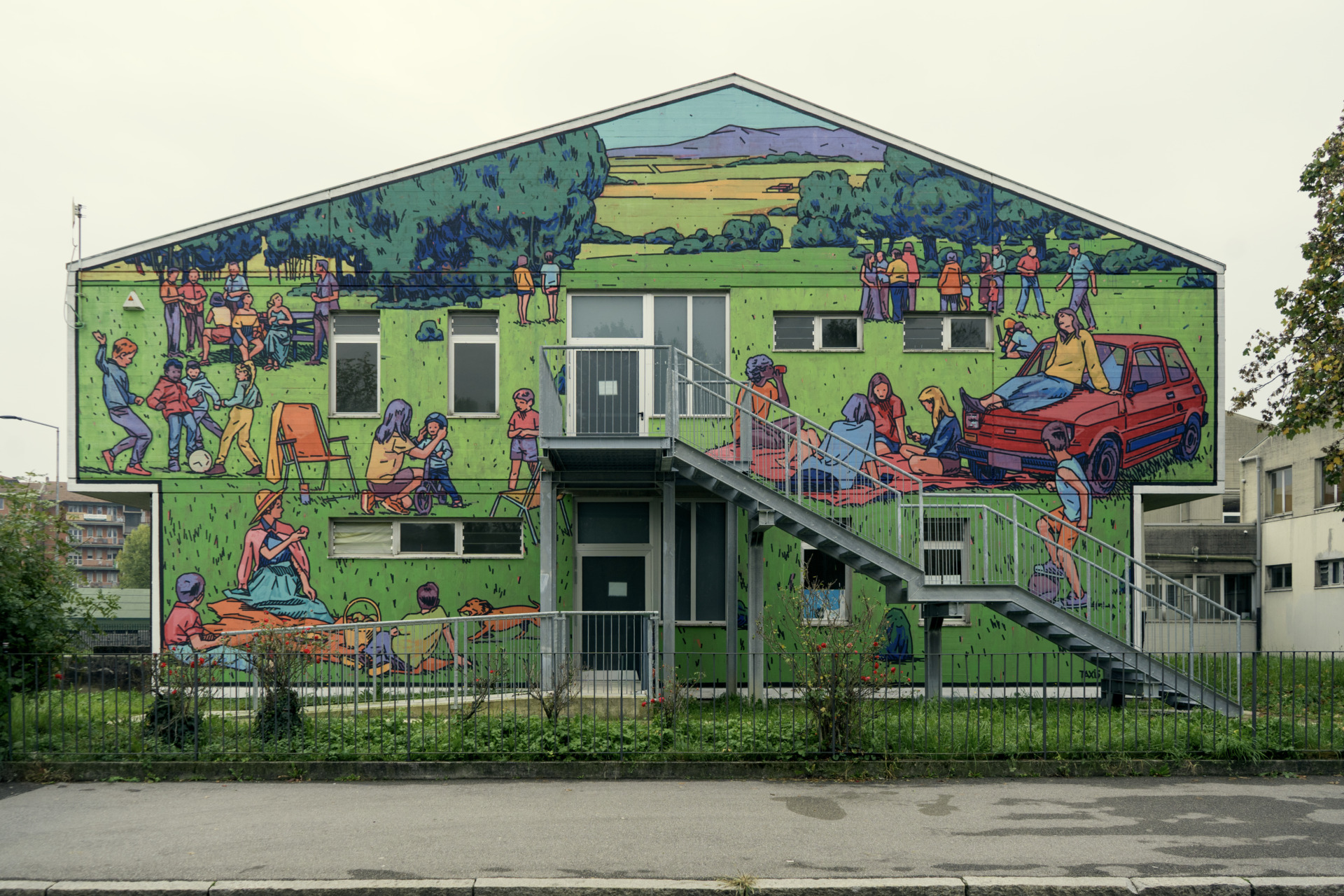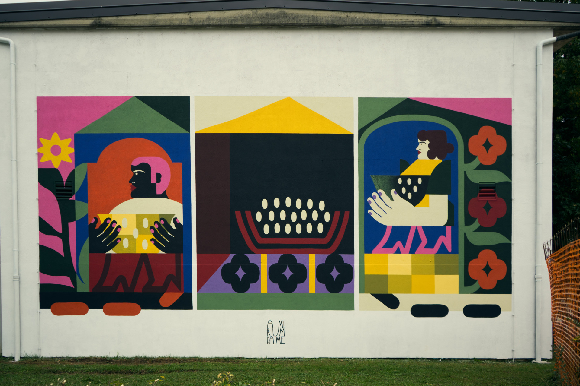 Le loro creazioni oggi colorano pareti di scuole, condomini e spazi pubblici. Ogni murale è nato da incontri e laboratori che hanno coinvolto la “gente del posto”: residenti, studenti, associazioni, bambini e giovani, trasformando le idee raccolte in vere e proprie opere permanenti. Il risultato? Un museo gratuito e diffuso, che si visita semplicemente camminando per la città.