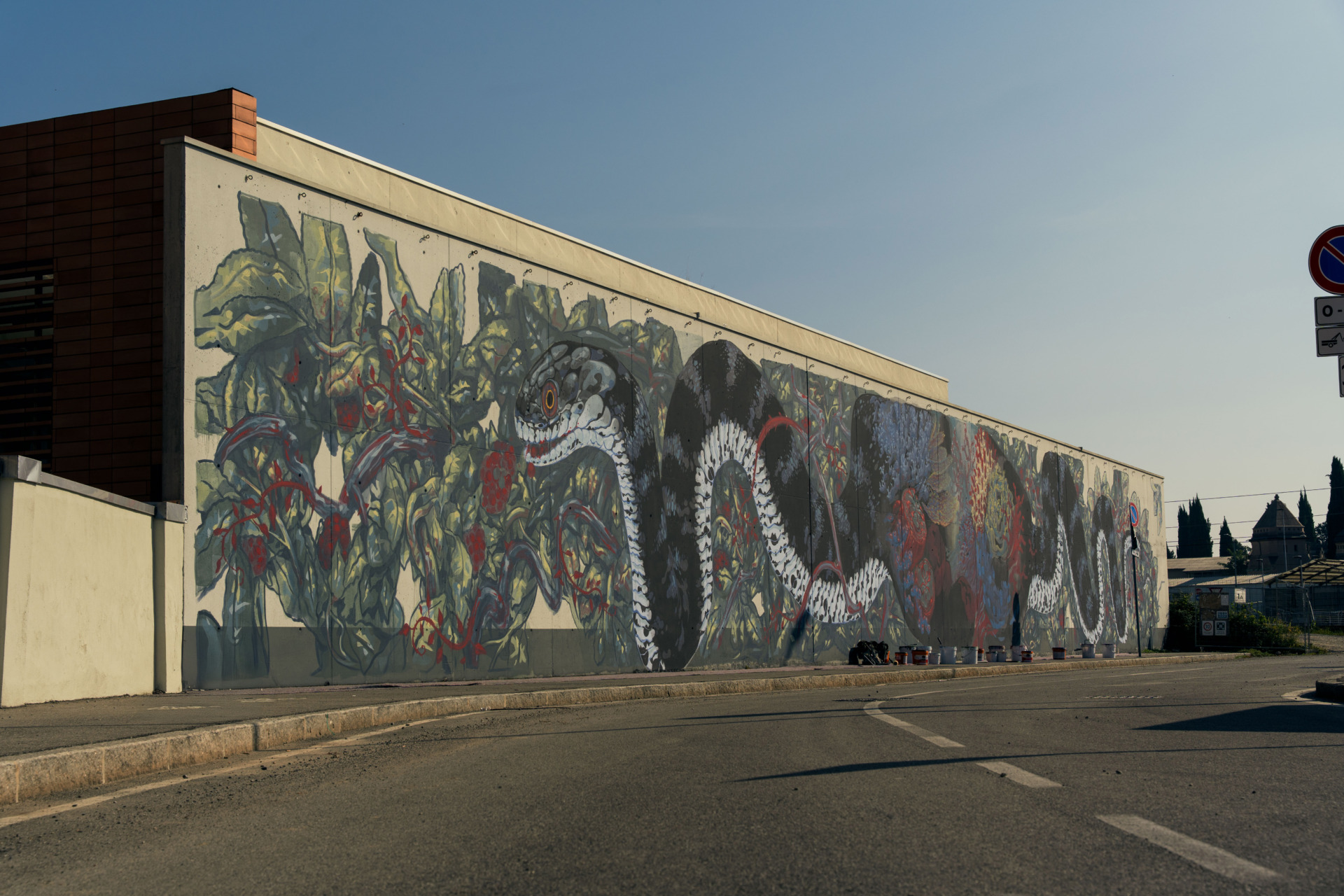 - Hitnes – Il serpente tra i rovi: un enorme serpente si muove sinuoso su una parete, circondato da piante e fiori. Un richiamo alla forza della natura, che resiste e si intreccia con l’ambiente urbano. Un’opera piena di movimento e dettagli, tipica dello stile dell’artista romano.
