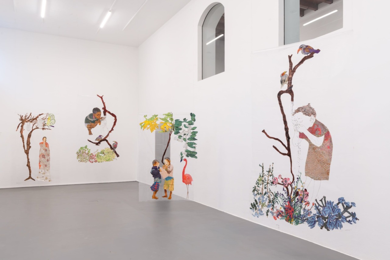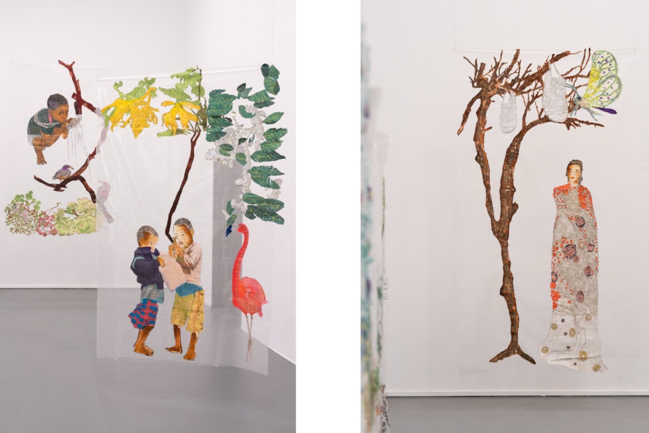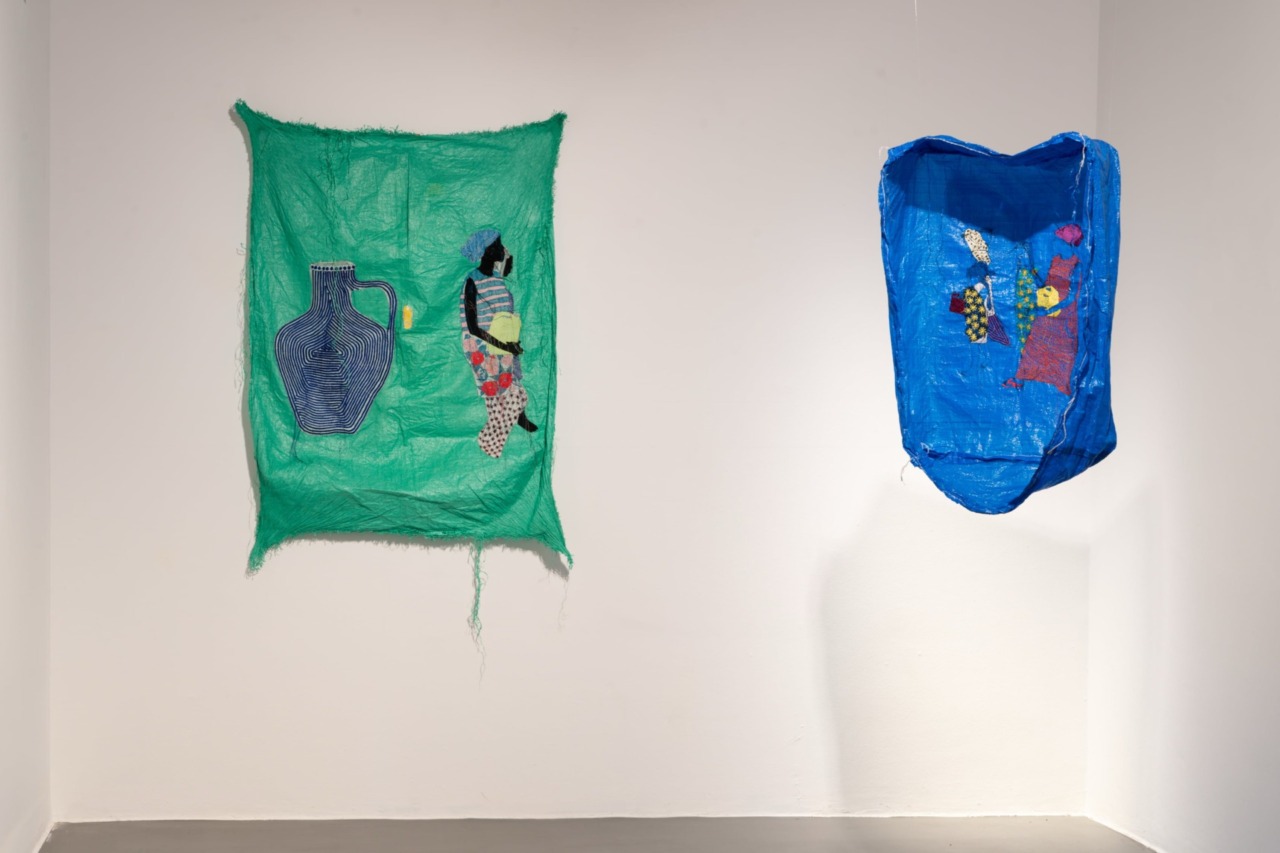 In mostra anche la serie O Fardo/Vestir Memórias, realizzata con sacchi di plastica e rafia usati per il trasporto di abiti dall’Europa all’Africa. Oggetti legati ai circuiti globali del consumo diventano superfici narrative su cui l’artista ricama figure, scene quotidiane e simboli, trasformando materiali associati allo scarto in strumenti di resistenza e ricostruzione.