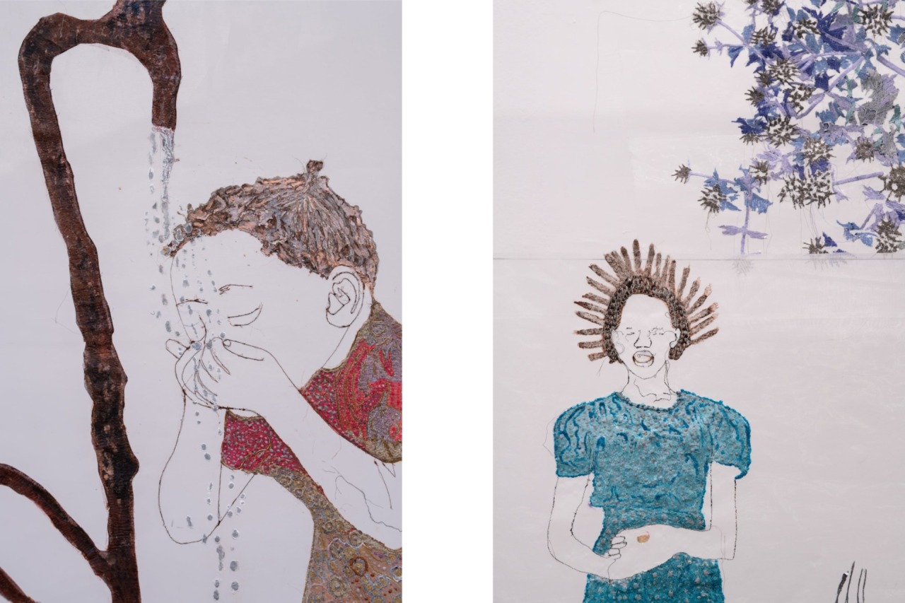 Attraverso il ricamo, linguaggio tradizionalmente legato alla cura e alla memoria, l’artista denuncia una realtà in cui l’acqua non è un diritto ma un privilegio. I tessuti industriali recuperati – spesso prodotti in massa per i mercati africani e poi trasformati in scarto – vengono risemantizzati, rallentando il tempo della produzione industriale e introducendo una dimensione manuale e corporea.