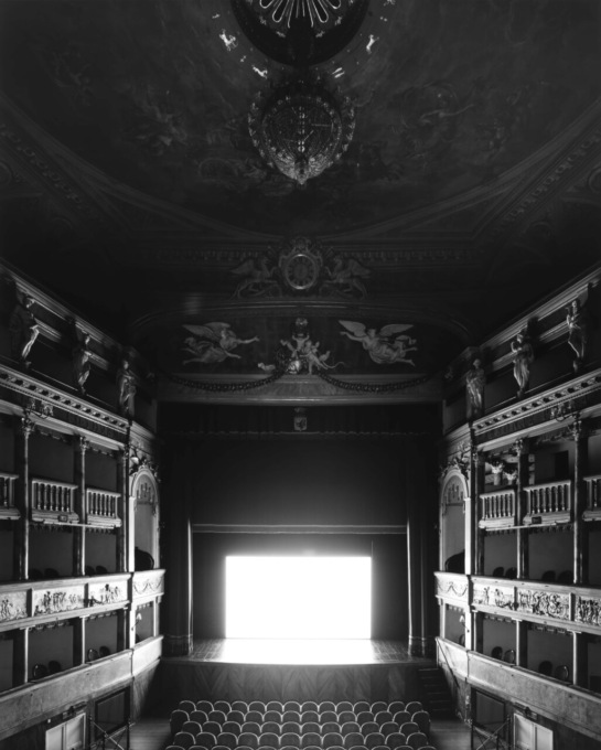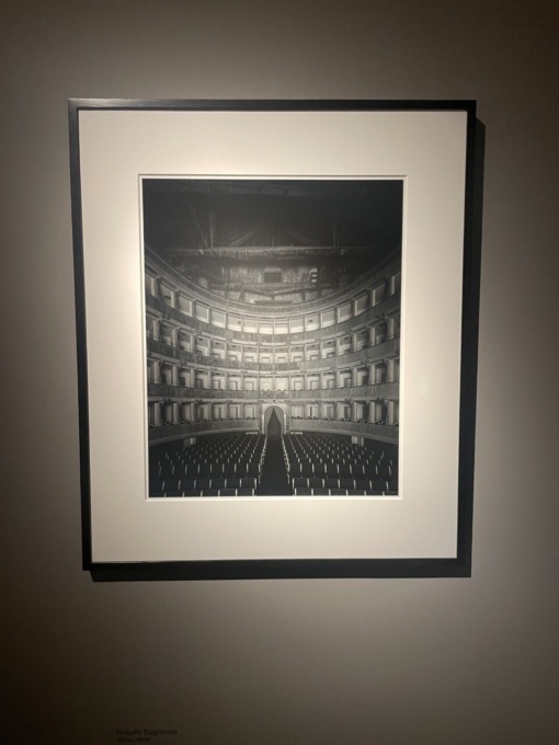 Filippo Maggia spiega: «Sugimoto si è chiesto cosa potesse succedere nel fotografare uno schermo cinematografico sul palco di un teatro. Ha lasciato l’otturatore apertoe come risultato finale ha scoperto che di questo rimane impresso solo e soltanto luce. Nei teatri italiani ha deciso di proiettare proprio film di questo Paese». Le foto, in bianco e nero, restituiscono quindi un senso di sospensione temporale, di pace, tranquillità e inducono al silenzio. Per la sua capacità di dialogare con l’ultima mostra tra pittura e melodramma, l’esposizione fotografica si trova al piano terra, alla fine del percorso della mostra temporanea.