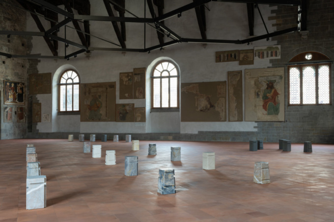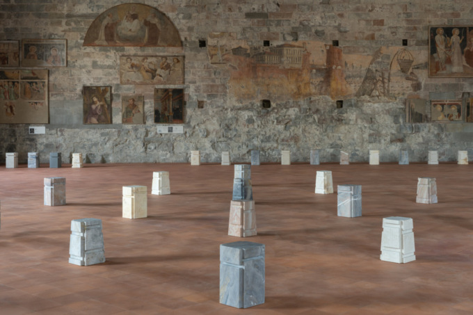 Le sedute che compongono l’installazione costituiscono in definitiva un invito rivolto ai visitatori a sostare per animare la Sala delle Capriate e viverla come luogo di scambio e relazione, di vicinanza e condivisione.