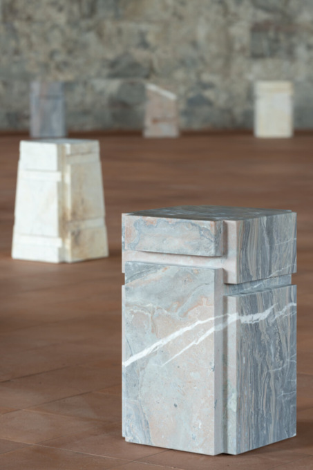 Le sculture sono realizzate in diverse tipologie di pietre che si ritrovano nei materiali di costruzione sia del Palazzo della Ragione sia di Piazza Vecchia, come nel caso della pietra di Sarnico nella facciata del Palazzo della Ragione e del marmo di Zandobbio nella Fontana del Contarini, e che vengono tutt’ora estratte dalle cave del territorio bergamasco. L’artista ha voluto in questo modo creare una stretta relazione con il territorio e la sua storia, nonché con l’architettura stessa del luogo che ospita la mostra.