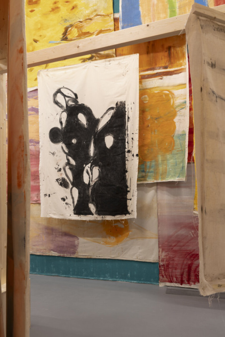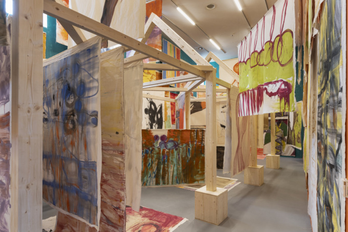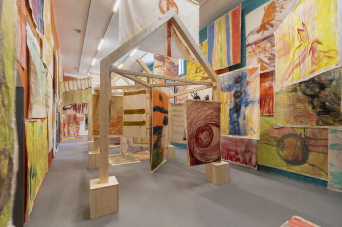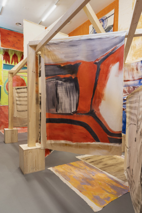 Al centro dello spazio espositivo, una struttura in legno evoca questa dimensione domestica, mentre le tele a essa sostenute, insieme a quelle distribuite sulle pareti della grande sala che le ospita – dipinte con gli stessi colori rosso porpora e verde acquamarina della casa dell’artista – simulano l’intreccio di forme, luci e colori caratteristica dell’ambiente in cui i lavori nascono e si trasformano.