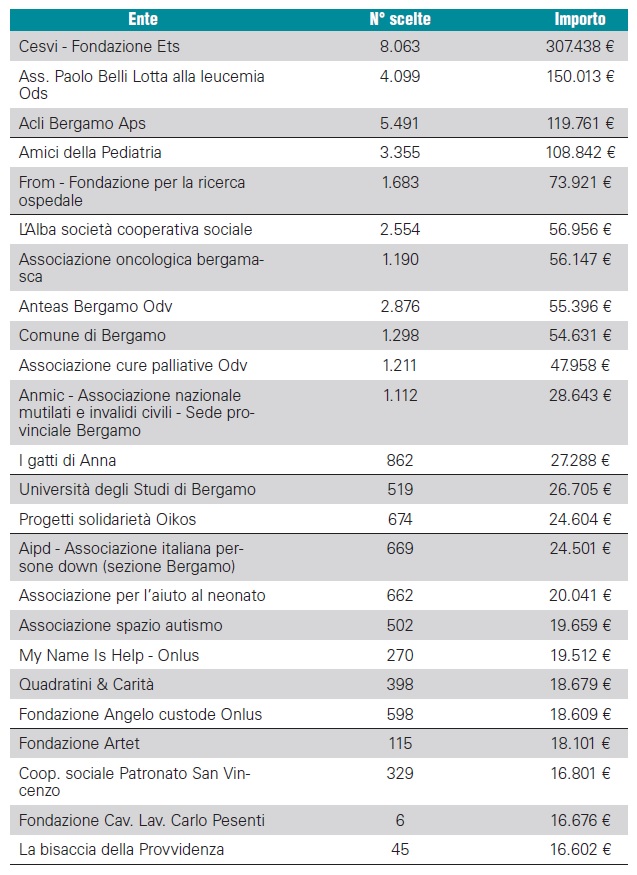 Chiudono il podio le Acli Bergamo, con un totale di quasi 120 mila euro frutto di di circa 5.500 scelte. Al quarto gli Amici della Pediatria, associazione che fa riferimento all’ospedale Papa Giovanni e che ha raccolto poco meno di 109 mila euro (3.355 scelte). Al quinto posto un’altra realtà legata al Papa Giovanni, ovvero From – Fondazione per la ricerca ospedale di Bergamo: nel 2025 ha raccolto quasi 74 mila euro grazie alla scelte di 1.683 contribuenti.