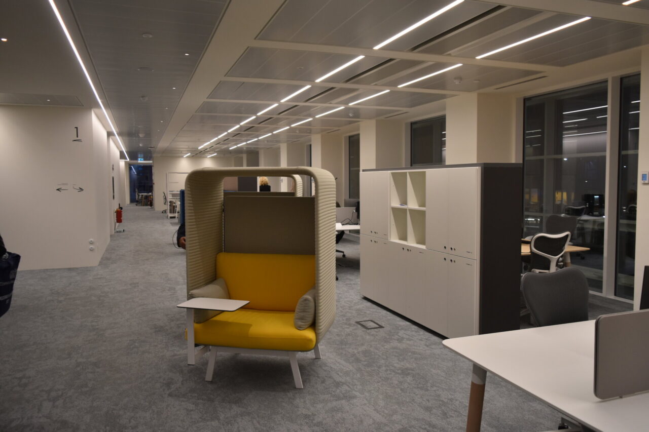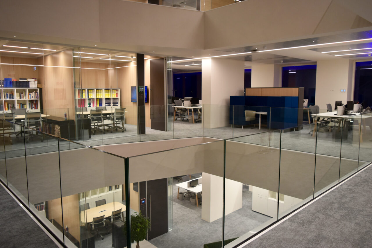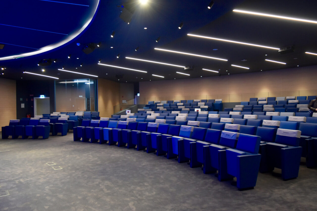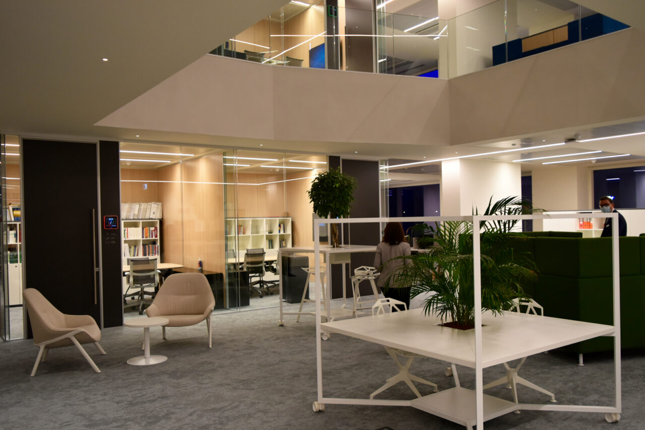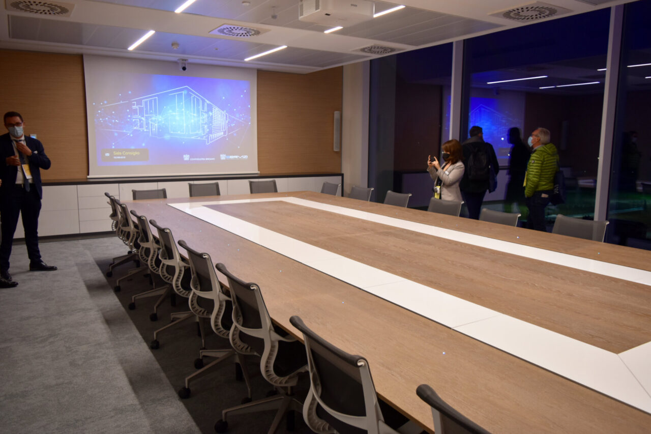Al pianterreno ci sono l’ingresso, l’atrio, le sale riunioni e la sala stampa. Al primo piano gli uffici per i funzionari e gli associati, diversi salottini, postazioni di lavoro e le “club house”, sale per incontri informali. Al piano superiore trovi invece le stanze di rappresentanza, gli uffici direttivi e un’enorme sala riunioni, dotata di ogni diavoleria tecnologia, audio, video e non solo. Un esempio: lasciando il cellulare sul tavolo, i sensori a led lo ricaricano in automatico. Una grande vetrata fa da parete esterna. Come fosse il ponte di comando di una nave, il piano direzionale sporge a sbalzo dal resto dell’edificio.