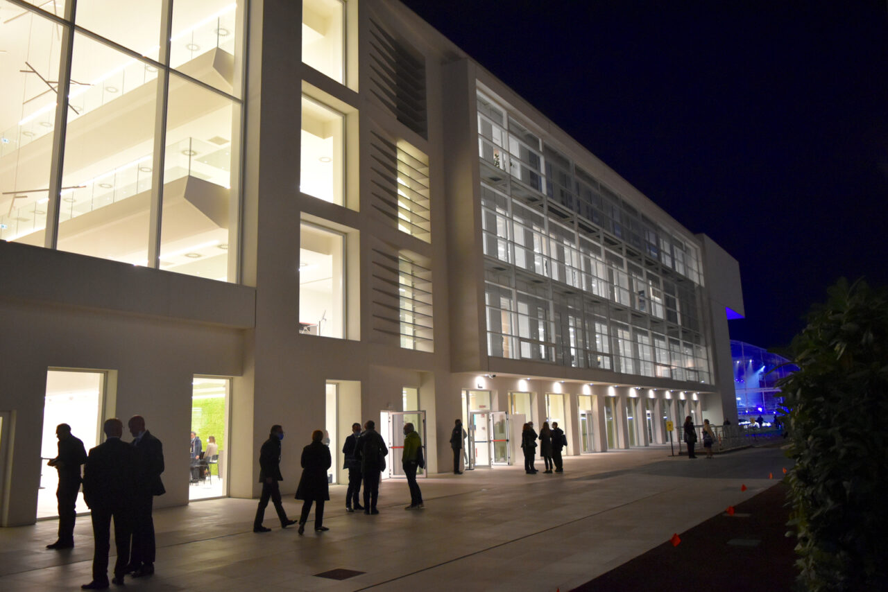 È un edificio di quattro piani più sotterraneo. Lo ha progettato l’architetto Riccardo Minelli. Tutto bianco, quasi un ossimoro per un’associazione che dell’olio e del grasso delle fabbriche aveva fatto epopea. Sarà che i tempi sono cambiati. Lo capisci anche dal nome della sede: “Evolve”. Ma chissà se si legge all’italiana, all’inglese o entrambi.