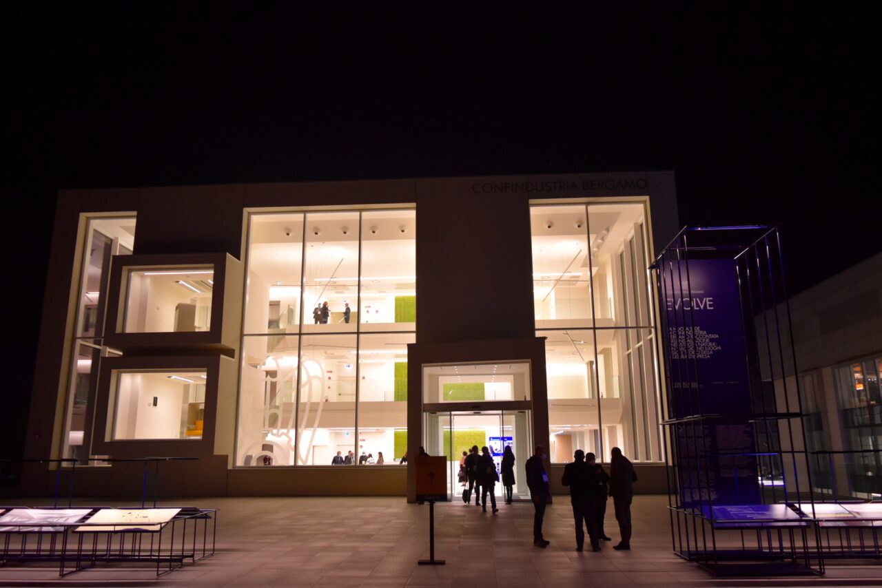 Il logo con l’aquila stilizzata e la scritta bianca li vedi da lontano. Recitano “Confindustria Bergamo”. Risaltano su quella parete immensa, che chiamano Kilometro Rosso. Poco più avanti, lungo il muro, si apre uno slargo. Sotto l’occhio vigile di guardie dall’aspetto truce, le hostess ti controllano i documenti, il Green Pass. Poi la febbre. Altri due sbarramenti, pass qr code e metal detector, e infine puoi visitare la nuova “cattedrale” degli industriali.