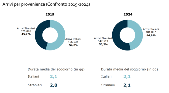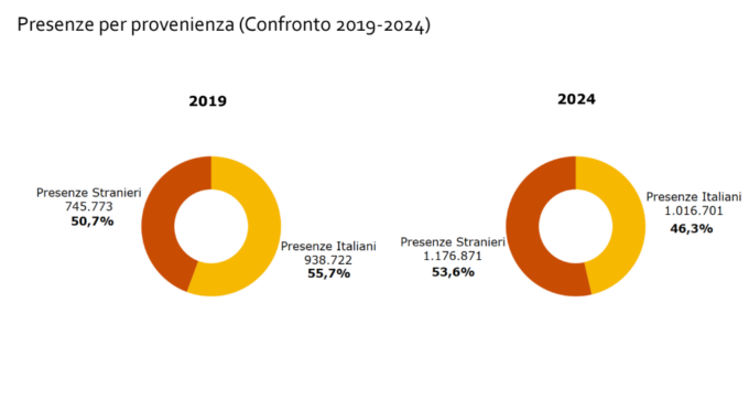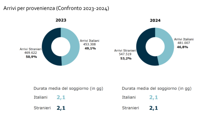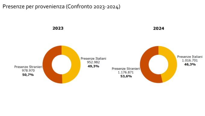 La provincia conferma il trend positivo di quest’anno, raggiungendo risultati che superano ampiamente le aspettative. Dopo l’anno record della Capitale della Cultura si registra infatti un +11,4 per cento negli arrivi e +13,5 per cento nelle presenze rispetto al 2023. Nel 2024, gli arrivi e le presenze di turisti stranieri hanno mantenuto un leggero vantaggio rispetto a quelli italiani, con una suddivisione che vede il 53,3 per cento degli arrivi e il 53,6 per cento delle presenze attribuite a visitatori internazionali, contro rispettivamente il 46,7 per cento e il 46,4 per cento degli italiani.