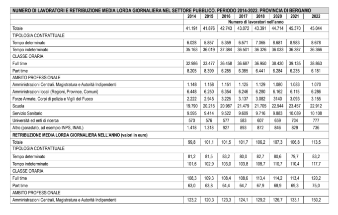 Partiamo innanzitutto dai numeri e dalla serie storica: nel 2014 i dipendenti delle amministrazioni locali (Comuni, Unioni, Comunità montane, Provincia, Camera di Commercio, ecc.) erano 6.448. Nel 2022 risultavano scesi a 6.286. «Il problema dell’attrattività è complesso e non può più essere ignorato, soprattutto nella nostra provincia dove il rapporto tra numero di abitanti e numero di dipendenti è ben lontano dalla media regionale e da quella nazionale (un dipendente per 221 abitanti a Bergamo, uno ogni 170 in Lombardia e uno ogni 126 in Italia)».