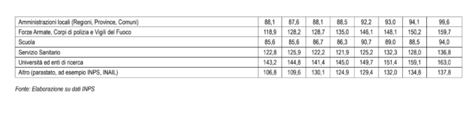 Nel periodo 2014–2022, l’inflazione è stata del 13 per cento e la crescita media degli stipendi del 13,05 per cento, praticamente un incremento di stipendio quasi nullo. In altri comparti pubblici è andata un po’ meglio: le retribuzioni medie giornaliere sono cresciute del 21,9 per cento nel settore delle amministrazioni centrali e del 34,3 per cento in quello della sicurezza. Peggio, invece, è andata per scuola e sanità, rispettivamente con il 9,81 percento e dell’11,4 per cento, al di sotto dell’inflazione.