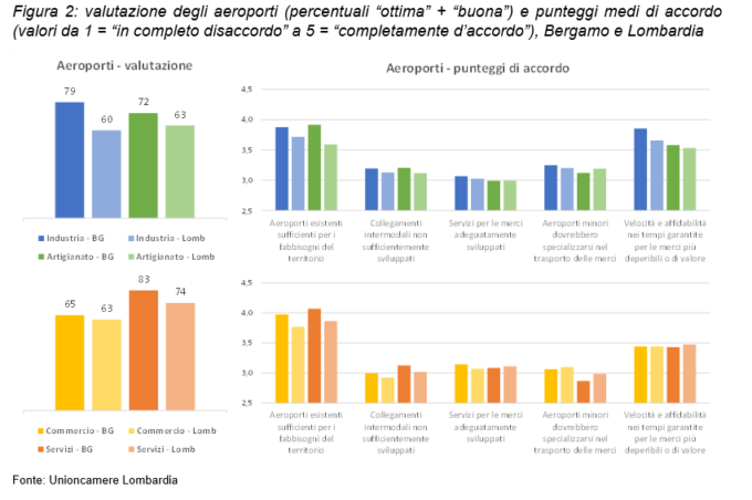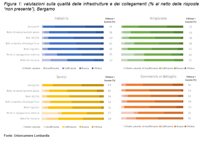 Il punto di forza della provincia, per lo studio, è rappresentato dall’aeroporto di Orio, in forte crescita negli ultimi anni: la somma dei giudizi “ottimi” e “buoni” si aggira intorno all’80 per cento nei servizi (83 per cento) e nell’industria (79 per cento), mentre per artigianato e commercio al dettaglio si ferma rispettivamente al 72 per cento e al 65 per cento. Sono giudizi decisamente più lusinghieri rispetto alla media registrata in Lombardia, dove il trasporto aereo rappresenta già un’eccellenza, visto che tre dei quattro aeroporti della regione (tra cui appunto il Caravaggio) fanno parte del “core network”, ovvero la rete centrale prioritaria individuata a livello europeo.