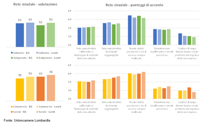 Le valutazioni sulla rete stradale e autostradale da parte delle imprese bergamasche, che risultano in tutti i settori lievemente inferiori alla media lombarda, risentono della percezione del traffico sulle strade statali, provinciali e sulle vie di accesso (solo nel settore dei servizi il punteggio è migliore rispetto al dato regionale), oltre che della minore facilità di raggiungimento delle autostrade.