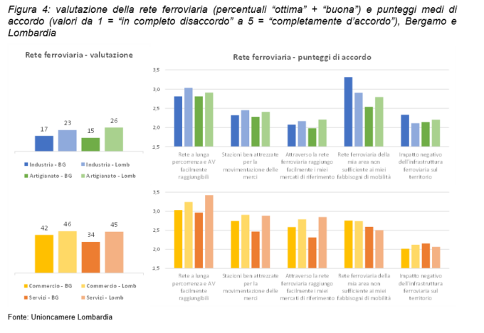 Per quanto riguarda invece la rete ferroviaria, principale criticità evidenziata dalle imprese orobiche con percentuali di gradimento decisamente inferiori al dato regionale, ci sarebbero problemi nell’adeguatezza della rete rispetto ai fabbisogni di mobilità, nell’accessibilità della rete a lunga percorrenza e ad Alta velocità e nella facilità di raggiungere i mercati di riferimento, delineando di fatto una situazione di sostanziale isolamento della provincia per quello che riguarda i trasporti su rotaia.