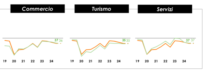 In generale ad avere maggiore fiducia sono le imprese del commercio e dei servizi, entrambe a quota 37, mentre il turismo si ferma a 35. Diminuisce la fiducia nell’andamento della propria impresa, si scende infatti da quota 48 a 45 e la previsione a marzo 2025 è stabile, a 45 (inferiore rispetto alla media nazionale dove è a 48).