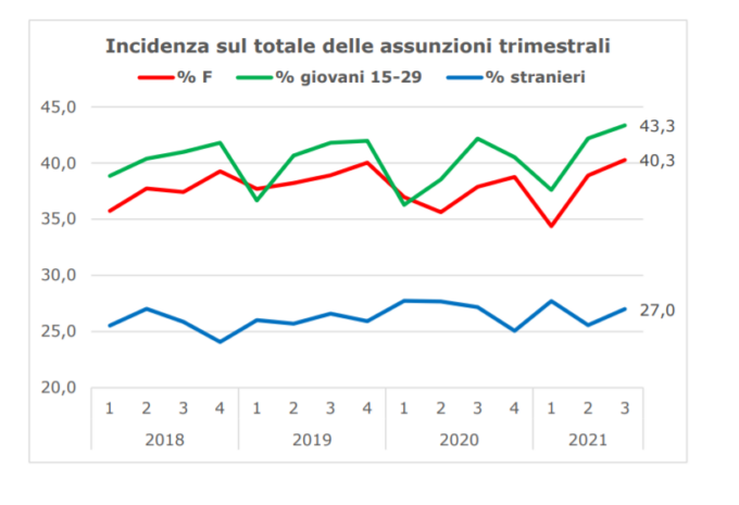 In aggiunta, sono anche cresciute le assunzioni di giovani fino ai 29 anni, con un 43,3 per cento del totale, anche se il fenomeno interessa la componente italiana più che quella straniera.