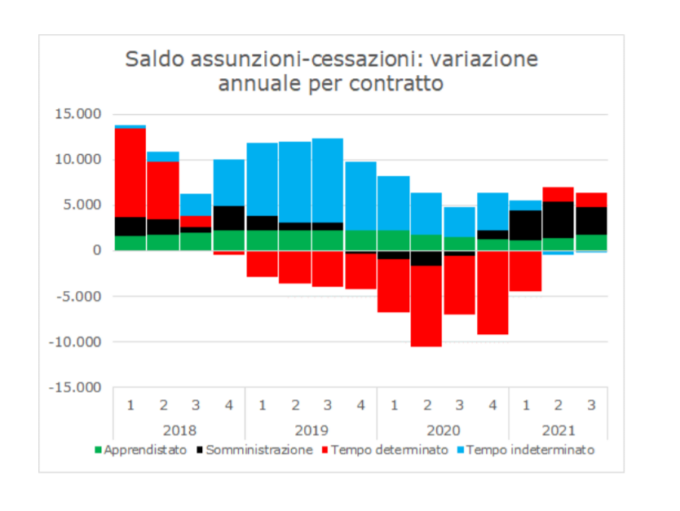 Diminuiscono ancora però i contratti a tempo indeterminato, non tanto per i licenziamenti quanto per le dimissioni, che sono state più di 12mila negli ultimi due trimestri e sono aumentate del 27,7 per cento rispetto allo stesso periodo del 2019. Al di là dei possibili casi di aggiramento dei divieti di licenziamento, queste potrebbero essere dovute, tra le altre ipotesi, a una ripresa della mobilità nel mercato del lavoro.