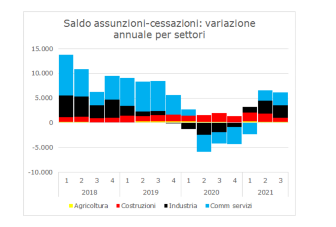 Le assunzioni, inoltre, sono cresciute nel terzo trimestre in tutti i macrosettori rispetto al 2019: nel settore del commercio e dei servizi si è arrivati a 20.595, con un incremento del +11,8 per cento, nell’industria 9.760 con il + 12,3 per cento, nelle costruzioni 4.028 con +12,5 per cento e infine nell’agricoltura 986 con il +20,4 per cento.