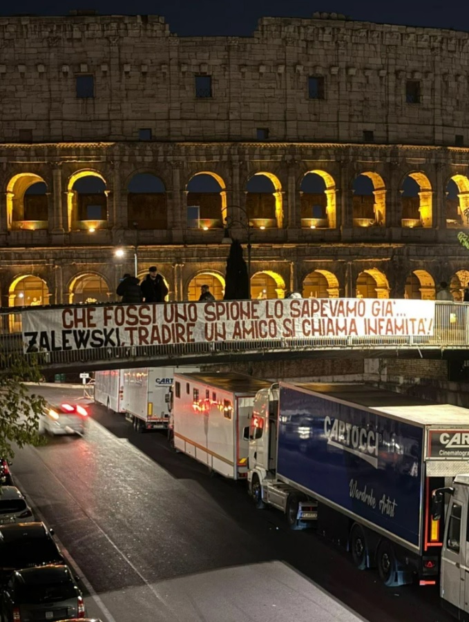Fatte le dovute premesse, è parso comunque un po’ esagerato il tono duro e accusatorio dello striscione che è apparso nella notte tra ieri e oggi (28 e 29 ottobre) in pieno centro a Roma, davanti al Colosseo, rivolto al nerazzurro. Sul maxi telo c’era scritto: « Che fossi uno spione lo sapevamo già… Zalewski, tradire un amico si chiama infamità». Immediato, per molti, il collegamento con il mondo ultrà, sia per lo stile che per le parole usate. In realtà, però, sembra che il calcio non c’entri nulla.