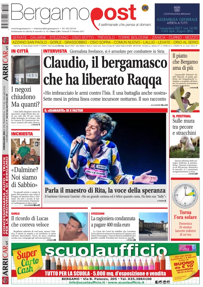 Gli argomenti, anche questa settimana, sono tantissimi. C’è una lunga e interessante intervista a Claudio Locatelli, trentenne di Curno che, per sette mesi, ha combattuto in Siria contro l’Isis e ci ha raccontato questa incredibile esperienza e perché ha scelto di farla. Il baritono Giovanni Guerini, insegnante alla CDpM di Bergamo, ha parlato con la nota firma Fabio Santini di Rita Bellanza, la ragazza in affido a una famiglia bergamasca che sta facendo innamorare tutti quanti con la sua voce a X Factor, che è stata sua allieva. Un focus sui risultati del referendum per l’autonomia; viaggio in via Maj, proprio ora che c’è la sua festa; il piatto più amato dei bergamaschi (macché casoncelli e polenta); tour per Sabbio, il quartiere di Dalmine che si sente un paese; il caso della ragioniera del Comune di Stezzano condannata a risarcire l’Amministrazione di ben 400mila euro; la proposta di un servizio di biciclette in affitto aperto a tutti a Seriate; il durissimo scontro verbale in atto a Torre Boldone tra maggioranza e minoranza dopo l’approvazione della variante al Pgt; la bella storia (e le tante foto) della Dinamo Popieluszko di Curno, una squadra che accoglie tutti e a poco prezzo (a patto di aiutare); le lamentele degli abitanti di Grassobbio per l’assenza di illuminazione in alcuni punti del paese e la maleducazione di alcuni ragazzi e la risposta dell’Amministrazione; l’incredibile vicenda dell’abbattimento dei pini marittimi a Comun Nuovo perché «fuori moda»; il ritorno in grande stile della Fiera Campionaria.