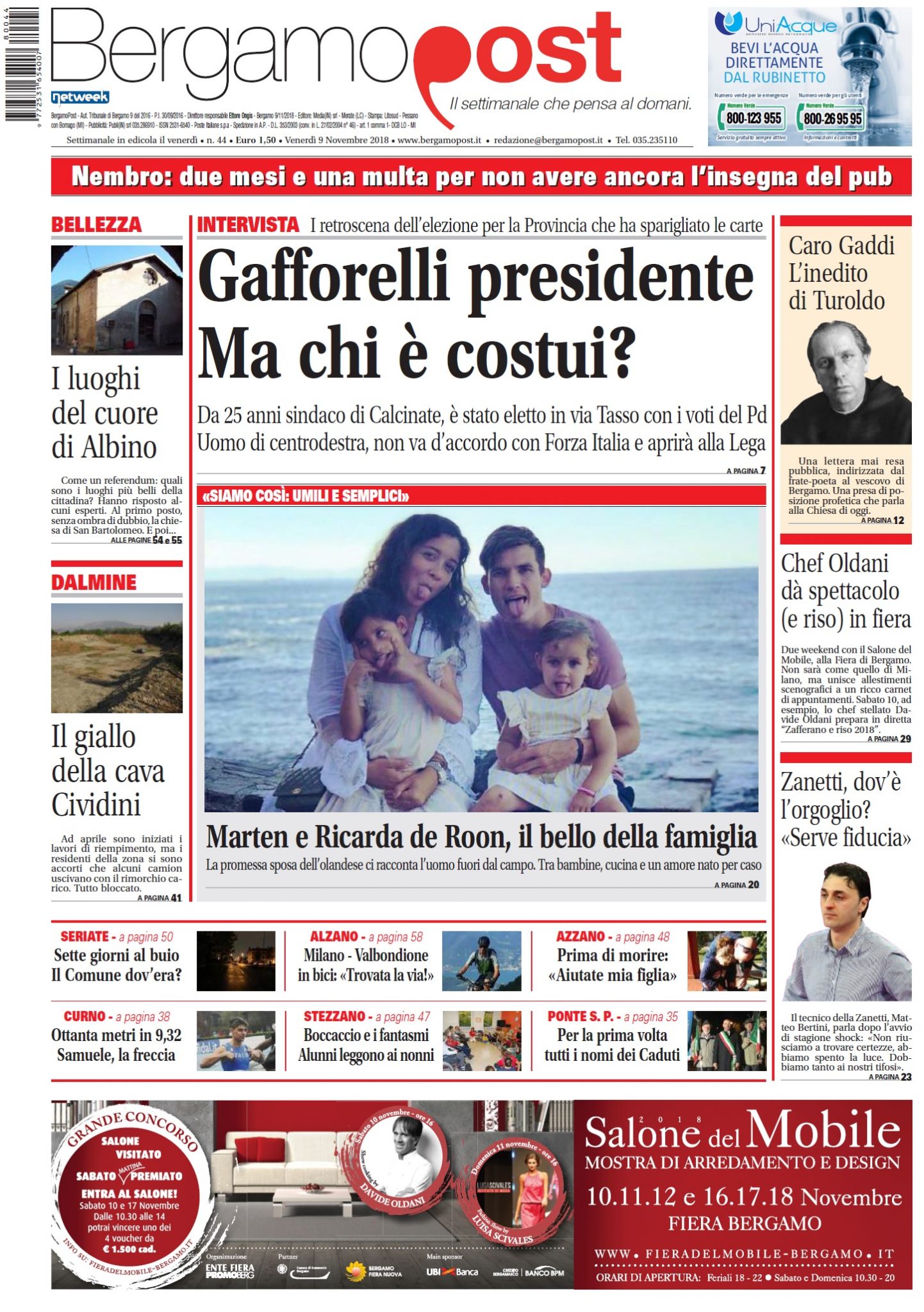 Il 31 ottobre, Gianfranco Gafforelli è stato eletto nuovo presidente della Provincia. Siccome (lo ammettiamo) non avevamo la minima idea di chi fosse, lo abbiamo incontrato e ci abbiamo fatto una bellissima chiacchierata, tra vita e politica. In più vi sveliamo alcuni retroscena del voto (pare veramente un thriller). In città, poi, teniamo i riflettori puntati sull’assurdo caso della vendita della chiesa degli ex Riuniti; reportage sui lavori in Santa Lucia, che più che un cantiere pare essere una guerra; l’apertura del nuovo punto vendita Aldi a Bergamo (ma dove fanno la spesa i bergamaschi?). E poi: intervista al grande fondista Rino Lavelli, che compie 90 anni, e una lettera inedita che Padre Turoldo scrisse all’allora vescovo Gaddi, nella quale criticava la Chiesa con argomenti che sono incredibilmente attuali. Per le pagine di Atalanta, una bellissima chiacchierata con Ricarda Kilian, compagna (e futura moglie) di Marten de Roon, che ci ha raccontato la vita del calciatore fuori dal campo, tra passioni e famiglia. Per lo sport, invece, abbiamo chiesto a coach Matteo Bertini di spiegarci il motivo del pessimo avvio di stagione della sua Zanetti Bergamo. Nelle pagine dedicate agli eventi, intervista a Neri Marcorè (al Creberg con il suo nuovo spettacolo), tanto altro teatro, buona musica e il Salone del Mobile alla Fiera di Bergamo, con tanto di piatti cucinati dallo chef stellato Oldani. In Provincia: a Ponte è già polemica per… le luminarie di Natale (son partiti presto, a quanto pare); a Curno festeggiamo invece Samuele Rignanese, che ha conquistato il titolo tricolore; a Dalmine l’incredibile caso della cava Cividini, da dove i camion portavano via la ghiaia (li hanno scoperti i cittadini); a Stezzano la commovente storia di Daniela, che prima di morire di un brutto male ha chiesto a tutti di aiutare sua figlia Sofia, affetta da una rara patologia genetica sin dalla nascita; a Seriate critiche al Comune dopo che in diverse vie non c’è stata la luce per un’intera settimana; ad Albino lo strano caso del centro sportivo di Rio Re, dove c’è tutto tranne il bar, e poi anche un bellissimo reportage sui luoghi più belli e amati del paese che andrebbero però salvati dal degrado e riportati al loro antico splendore; a Nembro, invece, vi raccontiamo la paradossale vicenda di Mauro, che da due mesi lotta con la burocrazia per poter mettere un’insegna per il pub che ha da poco aperto in via Stazione. Naturalmente, però, c’è anche tanto altro sul nuovo BergamoPost. Vi aspettiamo in edicola!