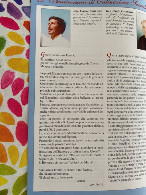 «Sull’immaginetta della prima messa avevo messo: “Carissimi, amiamoci gli uni gli altri, perché l’amore è da Dio”. È Lui che ti recupera sempre. Se il mio amore non è da Dio, la vita è tutta un peccato. Quando sono via, disorientato, è Lui che viene a ripescarmi. L’iniziativa è sempre Sua. È tutto una meraviglia».