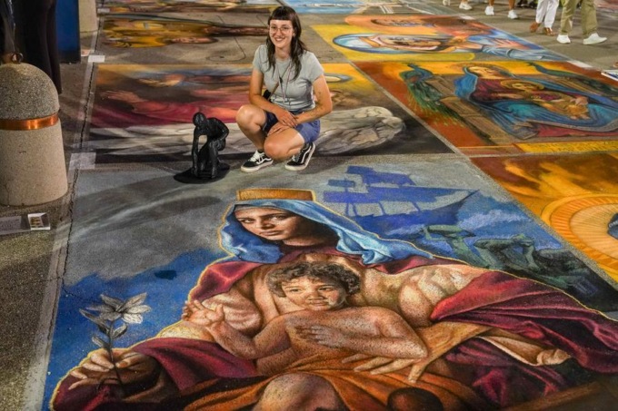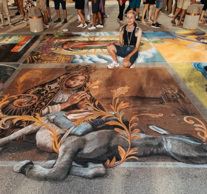 Giulia ha trionfato nella categoria “Maestri madonnari” con la “Madonna di Oaxaca”, icona venerata in Messico. La sua composizione, caratterizzata da un marcato sapore latinoamericano, ha colpito la giuria per la maturità artistica e la capacità di restituire intensità al volto della Vergine cara alla devozione popolare messicana.