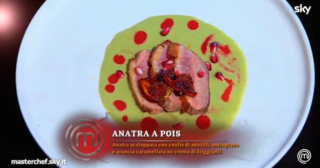 Il bergamasco ha presentato “Anatra a pois”, un’anatra scaloppata con coulis di mirtilli, melograno e arancia caramellata su crema di friggitelli. Un piatto che ha saputo conquistare gli chef Pavan e Barbieri e che gli è valso il grembiule ufficiale con il suo nome ricamato. Ora, Matteo fa parte del gruppo ufficiale in gara.