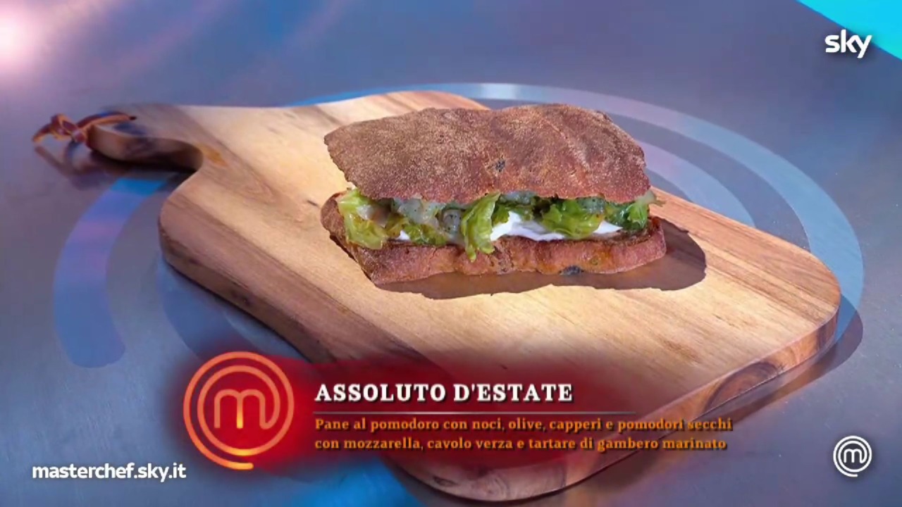 È toccato poi all’Invention Test che ha visto come ospite Alessandro Frassica e Francesca Casci Ceccacci, diviso in due parti: prima, i concorrenti hanno impastato il pane, poi il giorno successivo lo hanno informato e farcito. Il panino di Matteo gli è valso la vittoria e il titolo di capitano nella prova in esterna. “Assoluto d’estate”, questo il nome della sua creazione culinaria, è stato realizzato con pane al pomodoro con noci, olive, capperi e pomodori secchi con mozzarella, cavolo verza e tartare di gambero marinato.