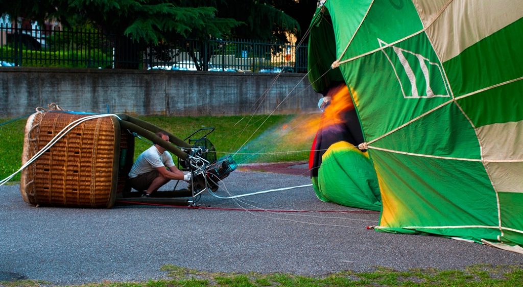 La mongolfiera è un aeromobile “semplice”, costituita da un bruciatore, un involucro e una cesta di vimini intrecciati. Il bruciatore scalda l’aria all’interno dell’involucro, il cosiddetto pallone, trasformando in fiamma il gas propano (GPL), contenuto in stato liquido nelle bombole. L’erogazione del gas al bruciatore e quindi le fiammate sono regolate dal pilota mediante appositi rubinetti e determinano la spinta e la velocità della mongolfiera che si aggira intorno ai cinque – sei, massimo dieci chilometri l’ora. Pilotarla però non è affatto un gioco e richiede anche una buona preparazione fisica: solo la vela pesa 100 chili e, con cesto e bombole, si tratta di portare in alto circa 400 chili, fronteggiando i capricci del vento.