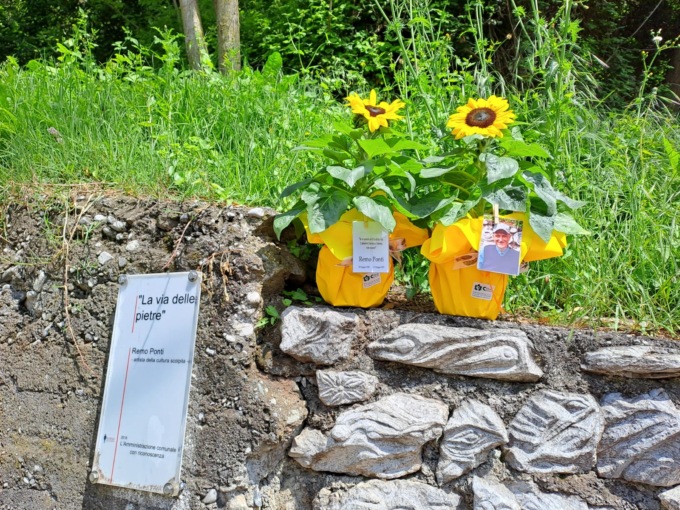 La via delle pietre è un luogo d’incontro e di emozioni: un’antica via nella campagna di Piazzo e un muro di circa trentacinque metri, interamente costituito da oltre mille pietre da lui scolpite. Un progetto iniziato il 13 settembre 2013, quando l’artista, sentendosi ispirato, decise di rendere un muro anonimo un’opera d’arte da regalare a tutti.