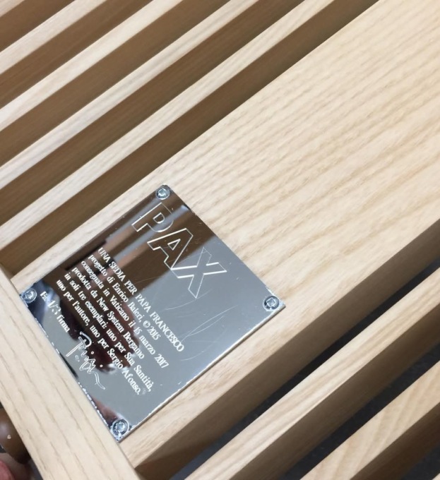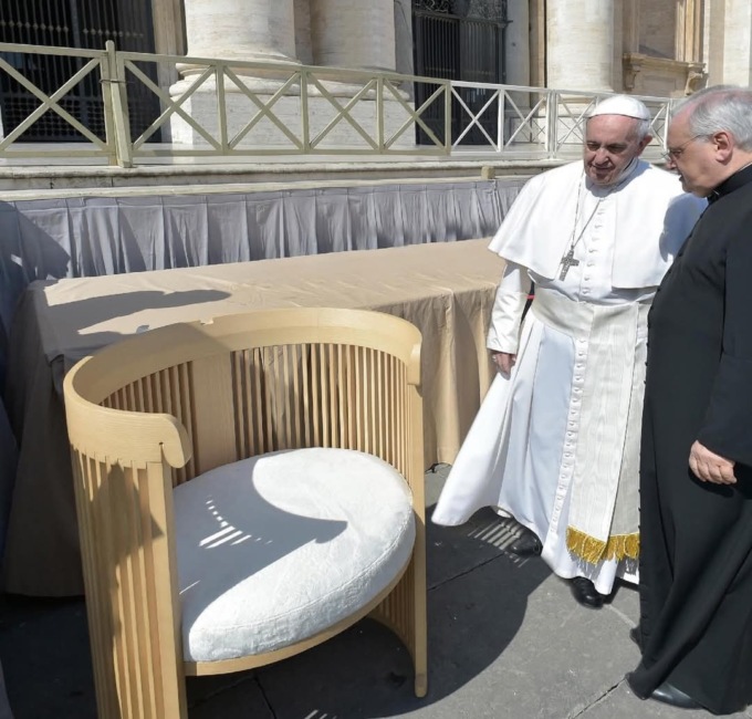 Infine, colpiscono quelle immagini che ritraggono una sedia sua creazione, non per nulla intitolata “Pax”, acanto a Papa Francesco. Il designer bergamasco gliela donò nel 2017 con la scritta, una sedia più attuale che mai in questo 2025 .