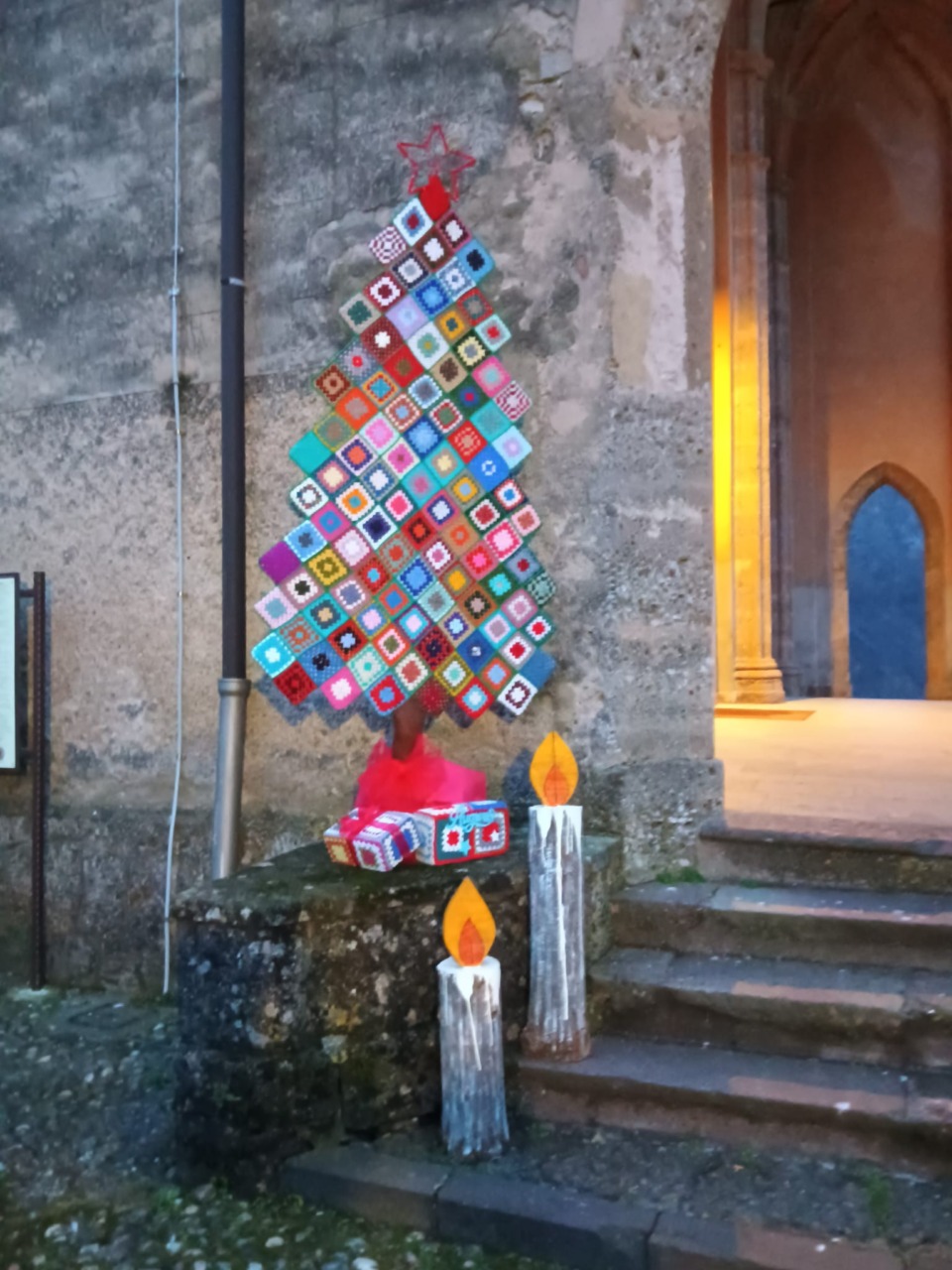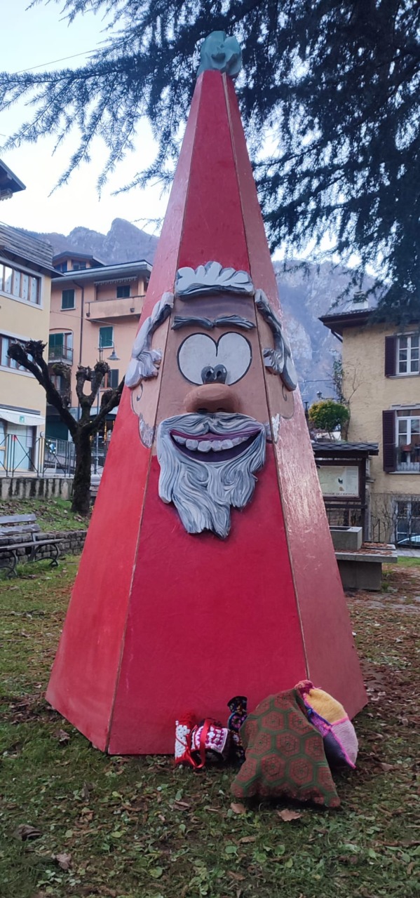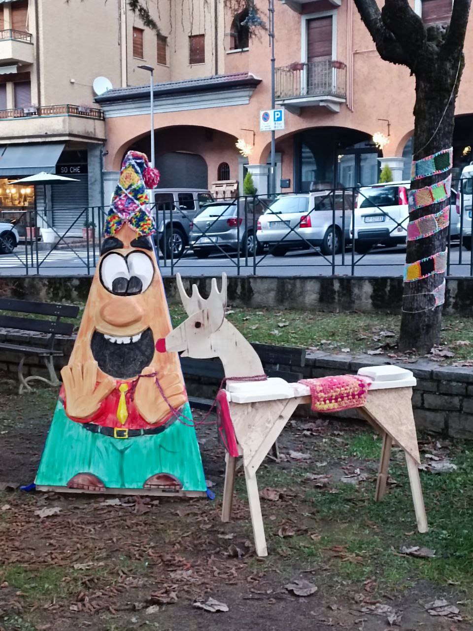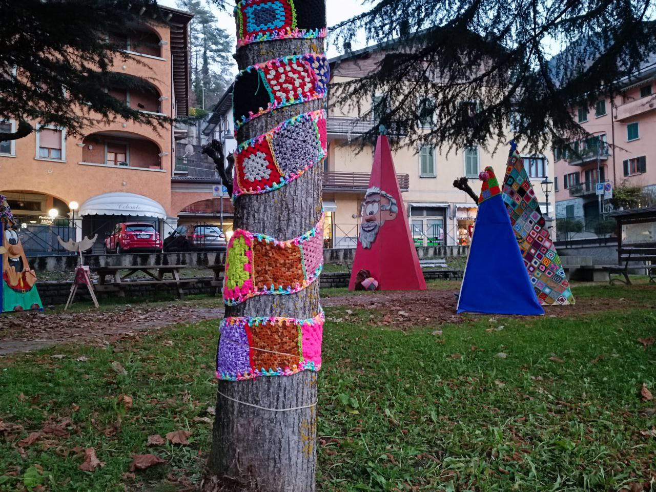 Con le piastrelle sono stati anche realizzati pacchi regalo distribuiti alle attività commerciali del paese, decorato il presepe posizionato sulla scalinata del monumento dei caduti e anche alcuni alberi ai giardini, dove Mario – uno dei volontari – ha realizzato in compensato e polistirolo una slitta con renna, un altissimo Babbo Natale e gli elfi Etto ed Etta, impegnati in un simpatico gioco che coinvolge tutto il paese: concludere l’albero all’uncinetto, lasciato appositamente incompleto, con disegni, regalini o nuove mattonelle. Dalla cima uno scoiattolo natalizio battezzato affettuosamente Gilda, sempre realizzato rigorosamente a mano, osserva silenzioso i passanti.