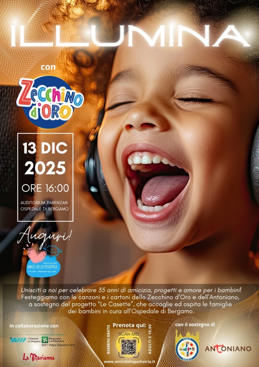 Il pomeriggio di sabato 13 dicembre, giorno di Santa Lucia, sarà particolarmente speciale per i piccoli pazienti dell’ospedale Papa Giovanni di Bergamo. Per celebrare i 35 anni di Amici della Pediatria, nell’auditorium Parenzan si terrà “Illumina” con le note dello Zecchino d’Oro per rivivere le canzoni che hanno accompagnato l’infanzia di generazioni.